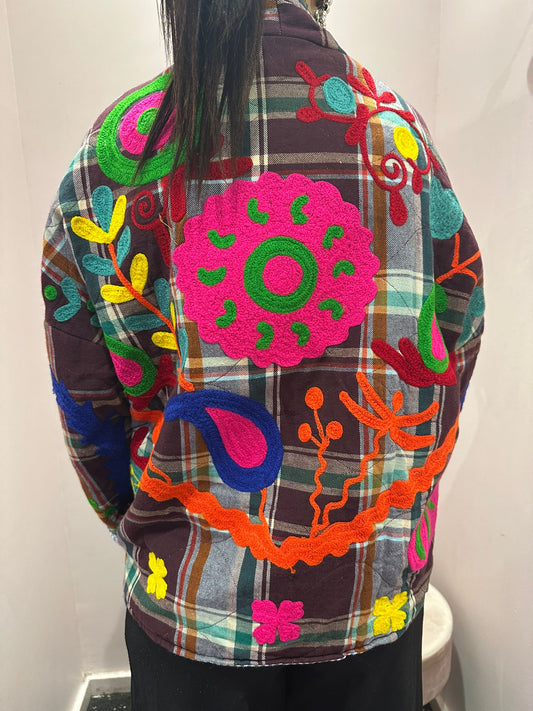 Kimono artisanal - tons bordeaux, bleu et gris, motifs jaunes