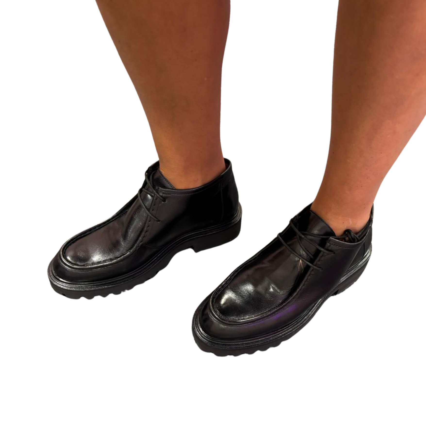 Ces boots noires combinent élégance et esprit urbain. Leur cuir lisse et brillant apporte une touche chic tandis que la semelle crantée oversized leur donne un côté moderne et affirmé. Un modèle pensé pour les looks de tous les jours comme pour booster une tenue plus habillée.