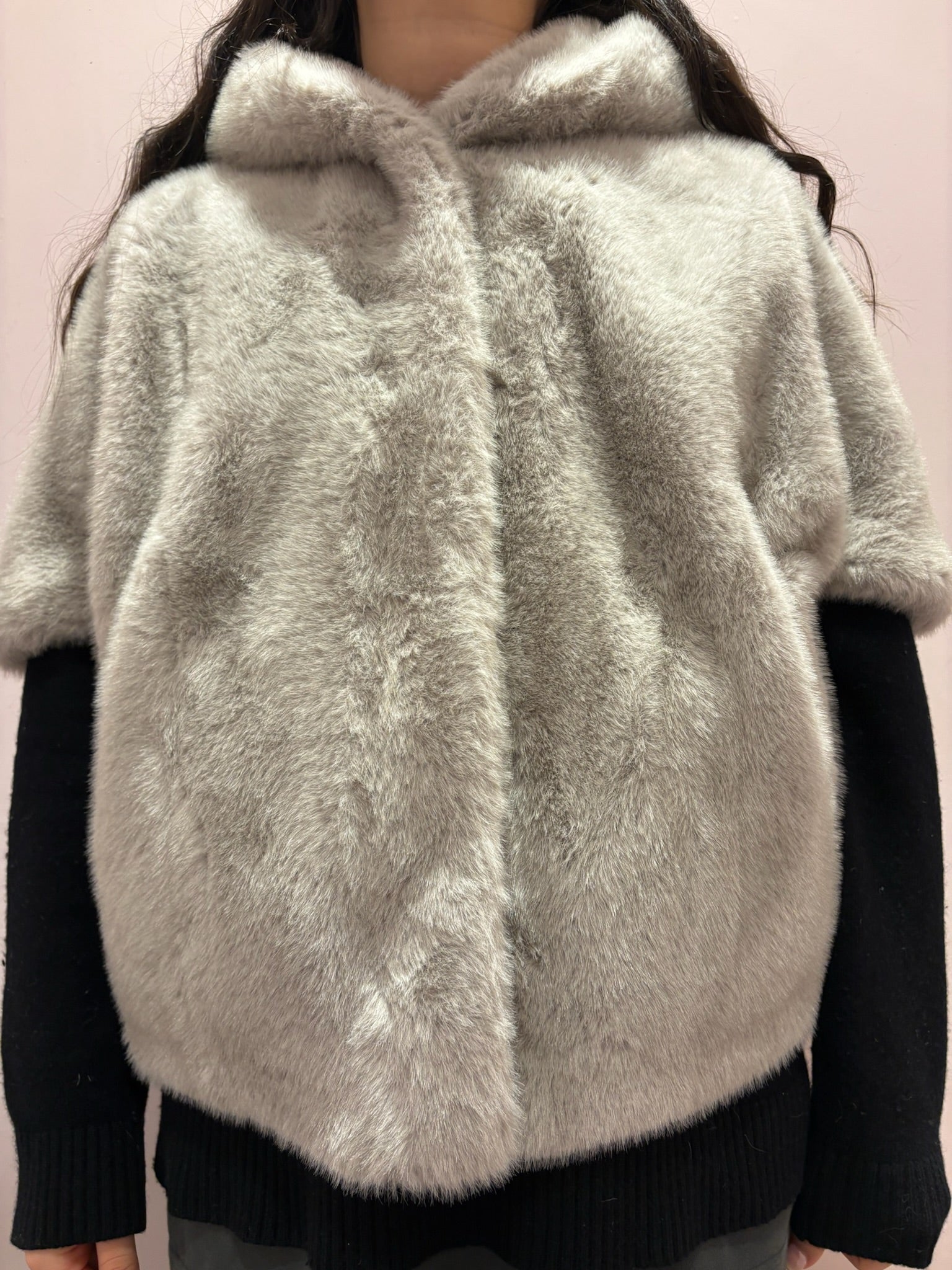 Cape à capuche en fausse fourrure douce, coloris gris perle. Coupe ample et moderne, idéale pour superposer sur un pull ou une robe. La capuche large vient structurer le look et ajoute une note douillette tendance.