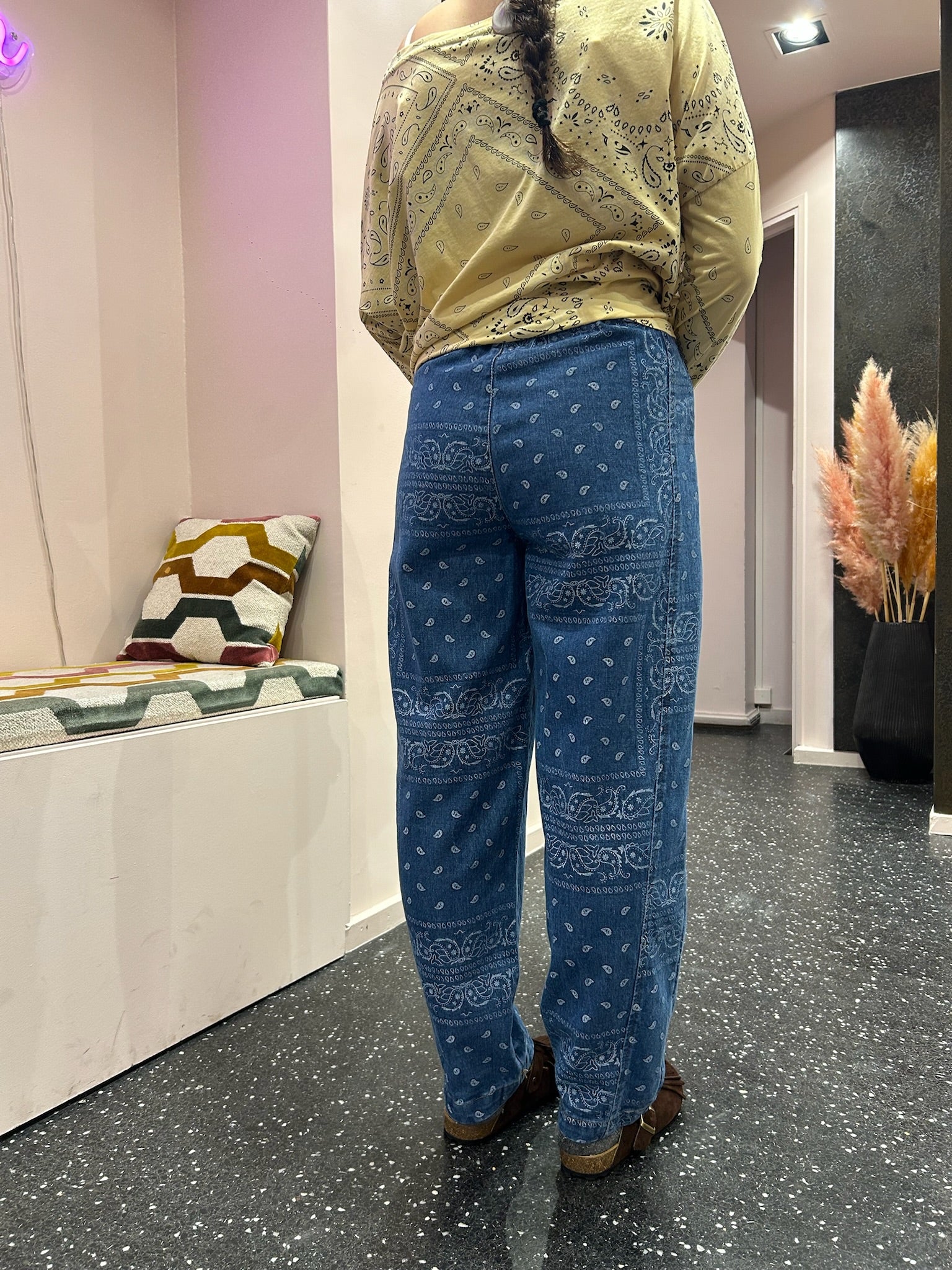 Ce pantalon en denim bandana revisite un classique du vestiaire casual avec une touche graphique forte. Confectionné dans une toile denim souple, il se distingue par son imprimé bandana all-over, à la fois affirmé et facile à porter.