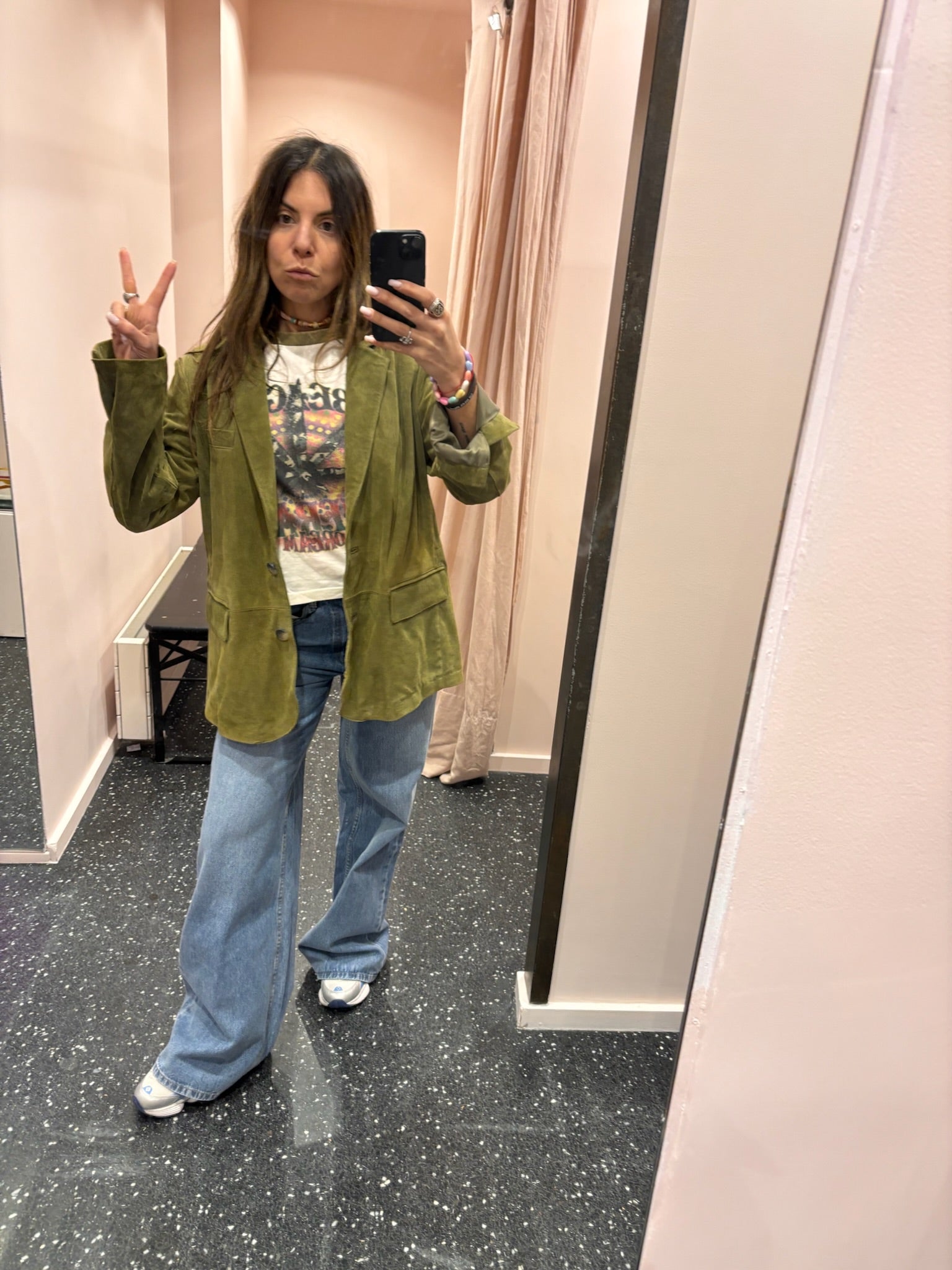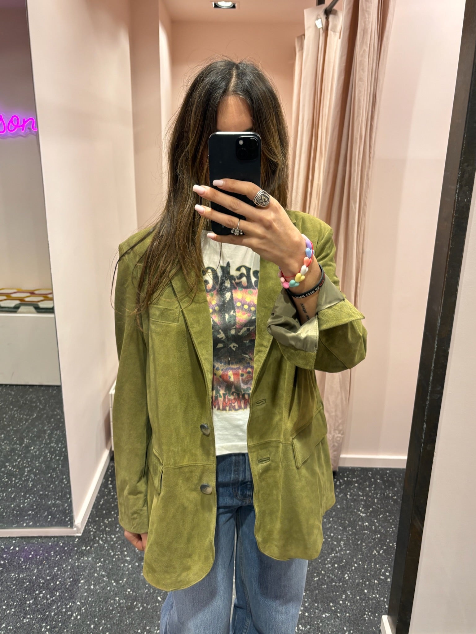Blazer en daim doux à la texture riche et lumineuse. Sa matière légèrement satinée capte la lumière et apporte immédiatement du caractère à la silhouette.