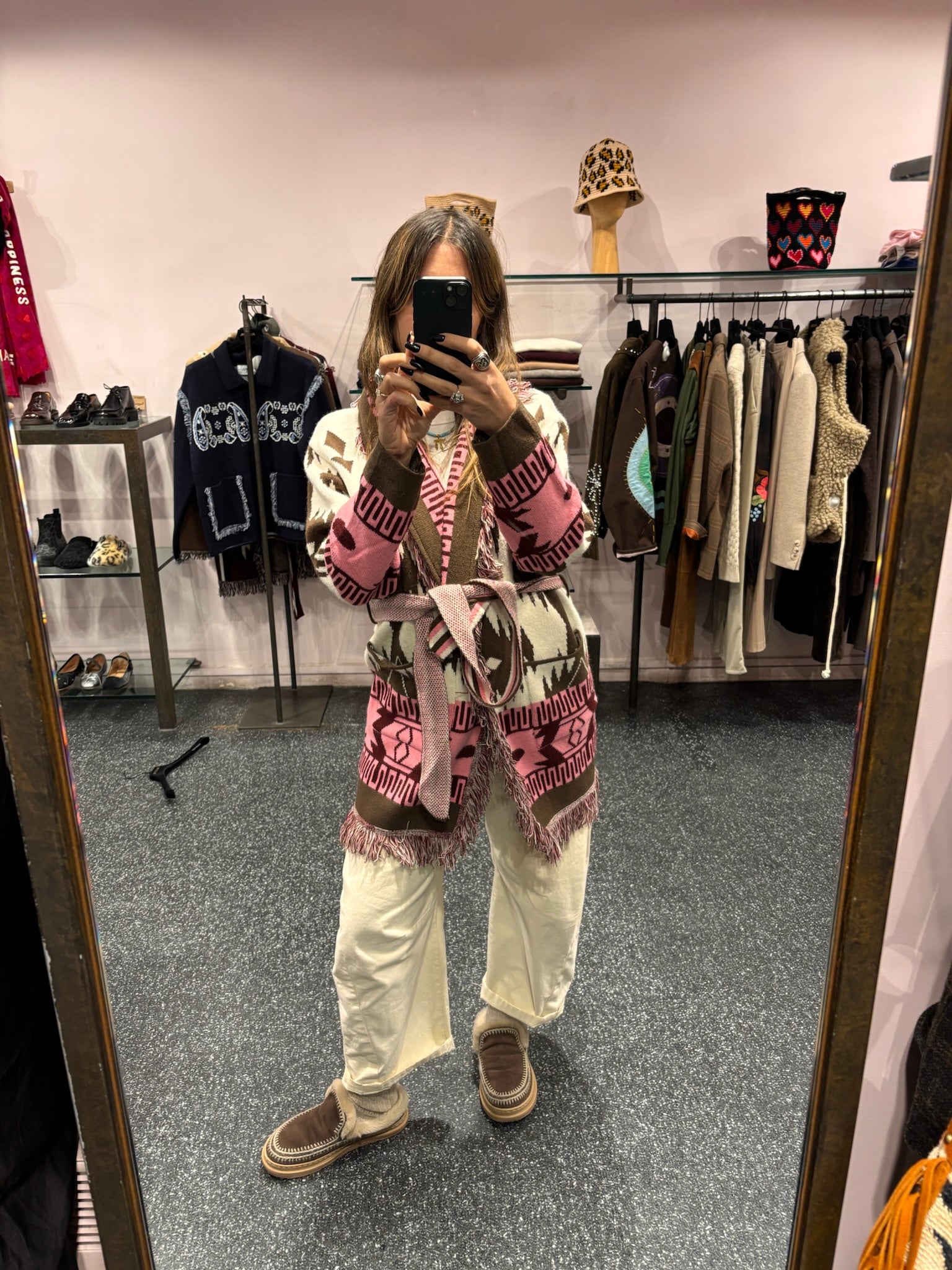 Gilet long à motifs aztèques, au tombé fluide et enveloppant. Maille chaude, motifs graphiques chocolat-rose-écru ou bordeaux et noirs et finitions frangées sur le col et le bas du gilet. La ceinture en maille crée une silhouette ajustable, entre gilet long et manteau léger.