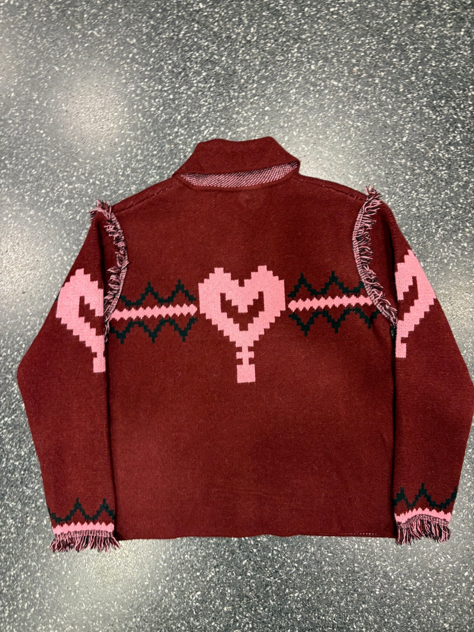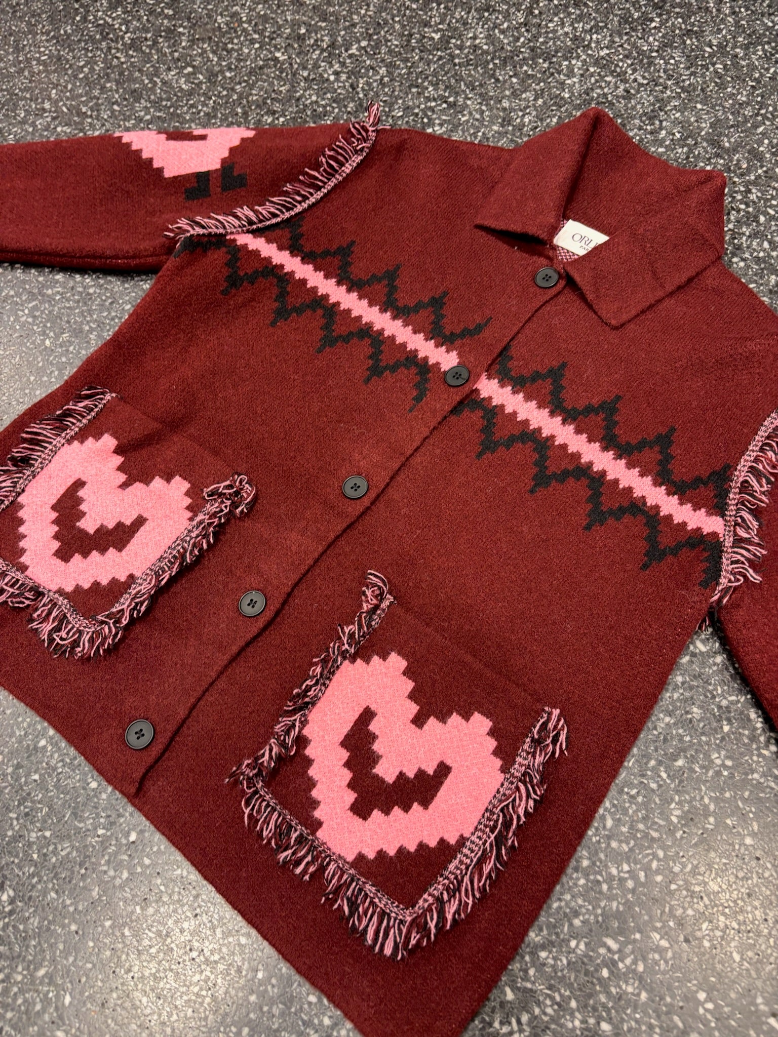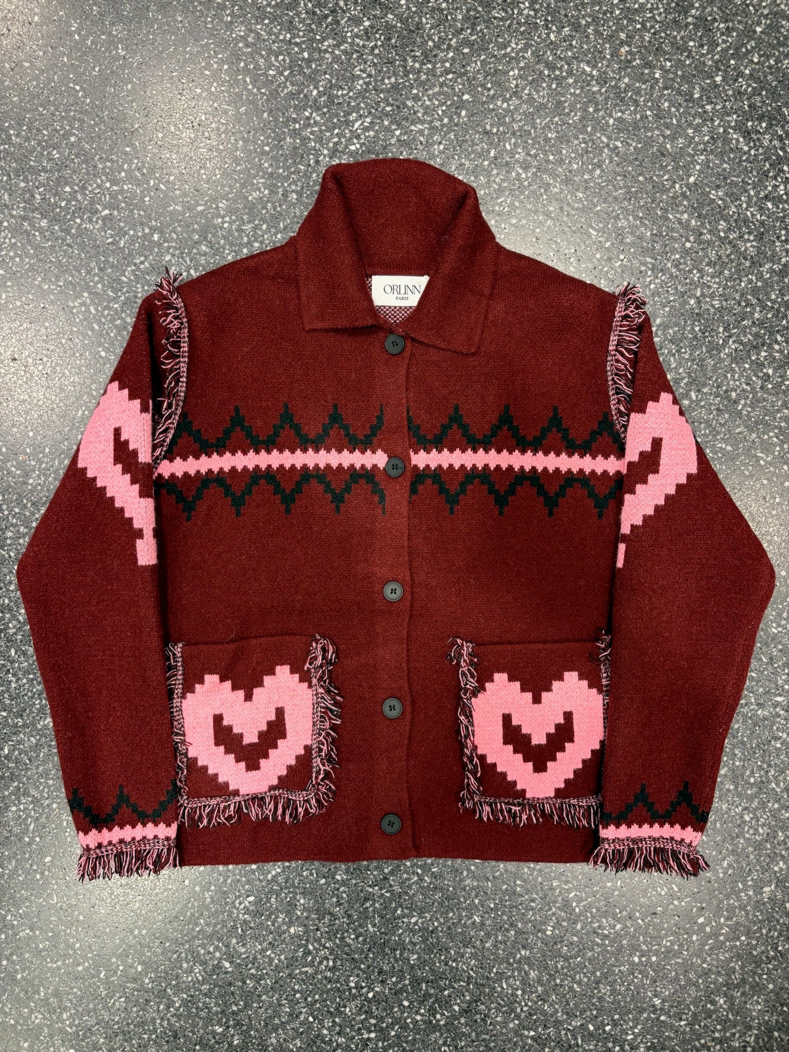 Gilet en maille épaisse de couleur bordeaux. Coupe courte, col chemise et deux poches pratiques bordées de franges. Idem aux épaules. Motifs tissés contrastés, de jolis cœurs roses devant et dans le dos, une maille dense et toucher doux, parfait pour la saison froide. À porter comme une pièce structurante, au-dessus d’un pantalon taille haute ou d’un jean.