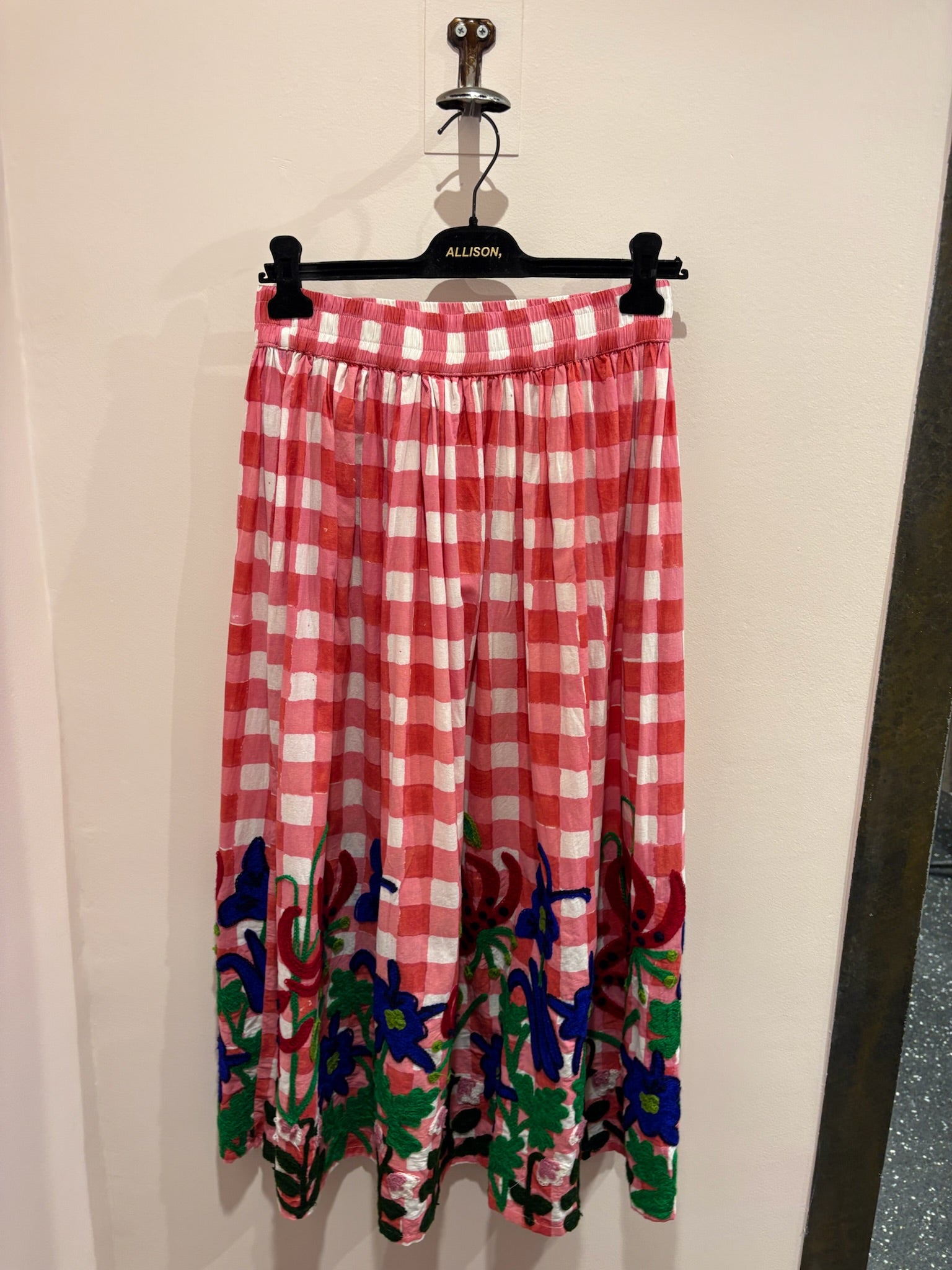 Sur un fond vichy rose et blanc, cette jupe se distingue par une broderie florale multicolore généreuse placée en bas de jupe. La coupe ample et la taille élastiquée offrent confort et mouvement, pour une allure à la fois fraîche et expressive.