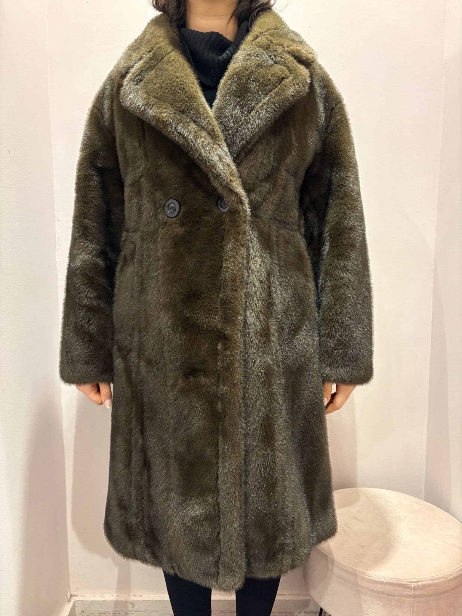 Manteau long à double boutonnage, entièrement réalisé en fausse fourrure marron foncé. Coupe droite, col large et finitions élégantes. Pour un style sophistiqué et ultra-cosy signé Allison Shop.