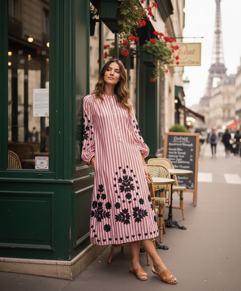 La robe Rikke est une robe fluide et élégante qui incarne parfaitement l’esprit bohème et raffiné de Sissel Edelbo. Confectionnée en coton recyclé, elle séduit par son imprimé de fines rayures roses et taupes, sa coupe ample et son tombé aérien, alliant confort et féminité.`