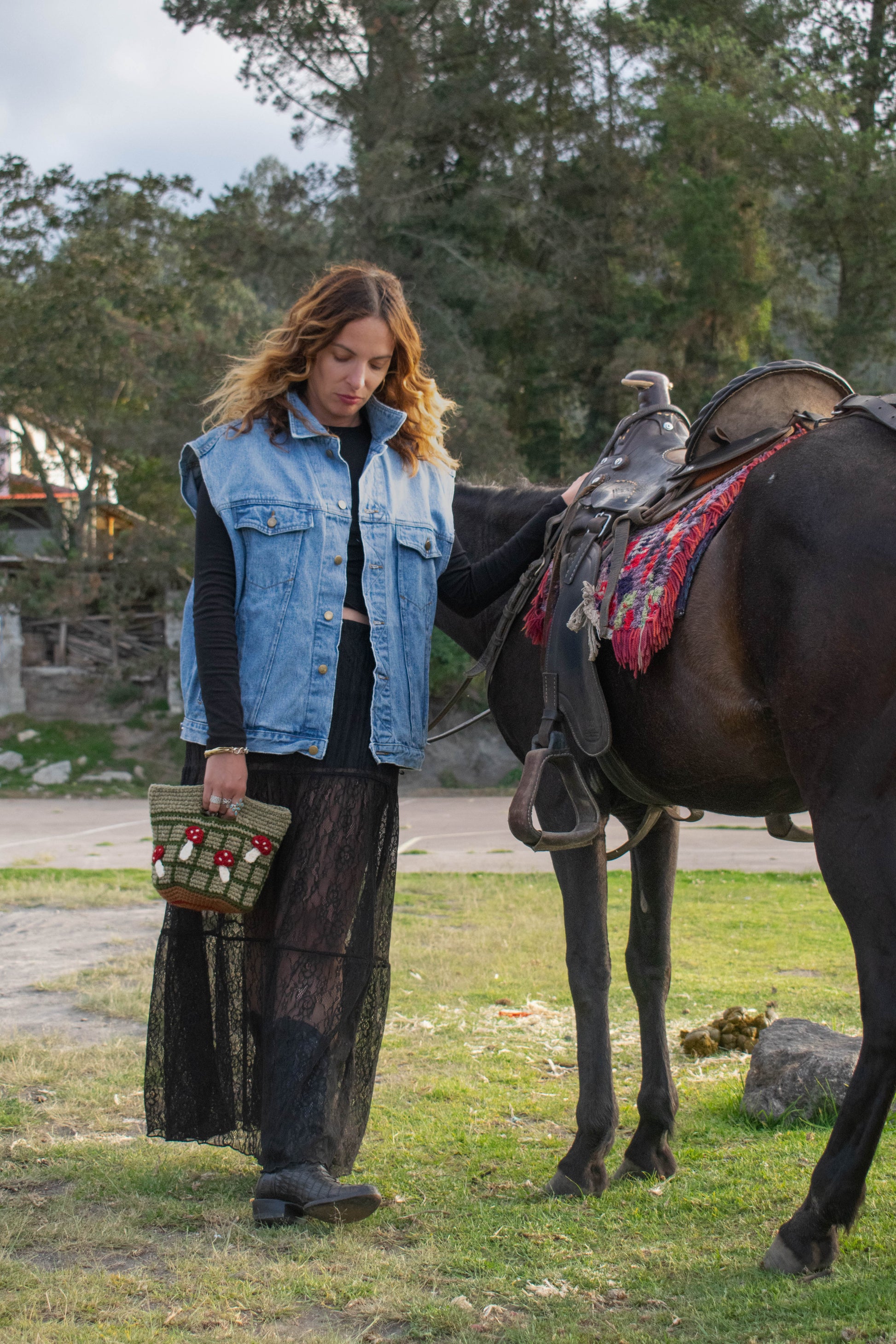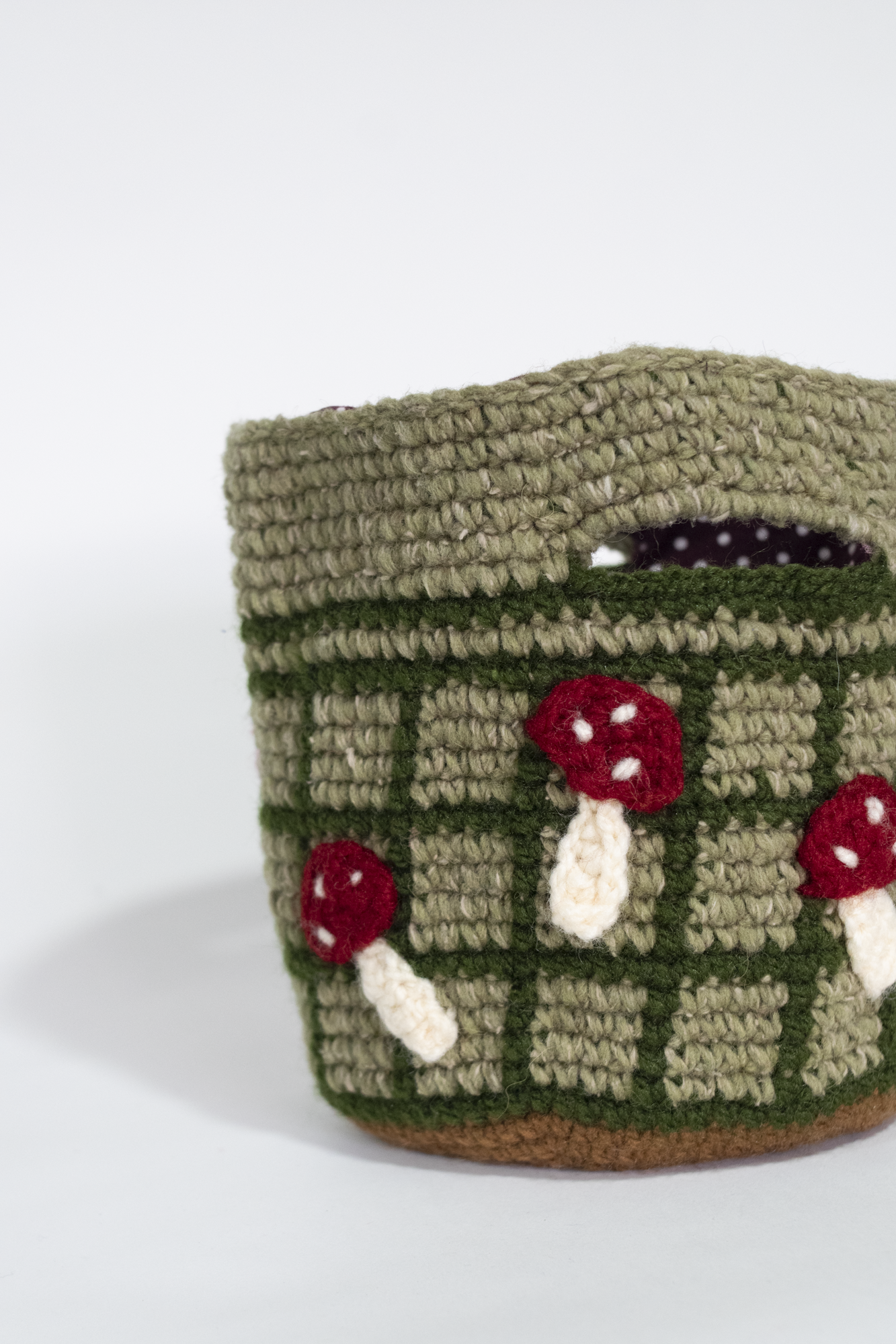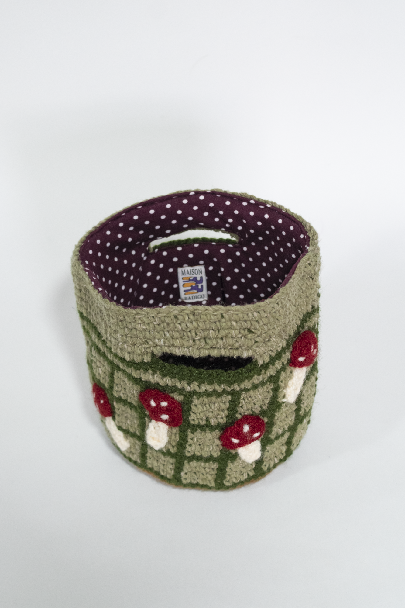 Mini format, maxi style. Le sac Mushrooms est un petit sac délicatement crocheté à la main en laine naturelle, habillé de motifs champignons espiègles sur un fond kaki et bordeaux. À l’intérieur, une doublure en tissu bordeaux à pois blancs vient ajouter une touche secrète, presque vintage — un joli clin d’œil à l’élégance rétro. Compact (20 × 22 cm), souple et léger, ce sac est un compagnon du quotidien empreint de caractère et d’originalité.