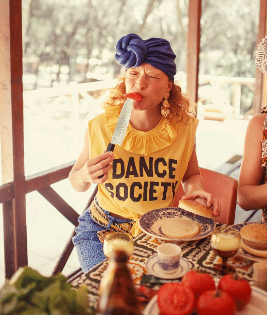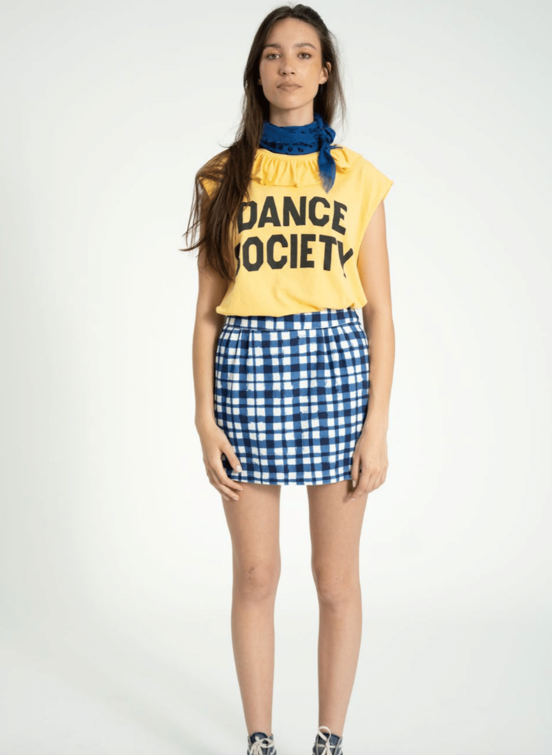 T-shirt sans manches en coton et lin avec col structuré à volants et imprimé “Dance Society” sur le devant. Coupe droite et matière légère, dans une teinte jaune vibrante qui apporte du dynamisme à la silhouette. Fabriqué au Portugal.