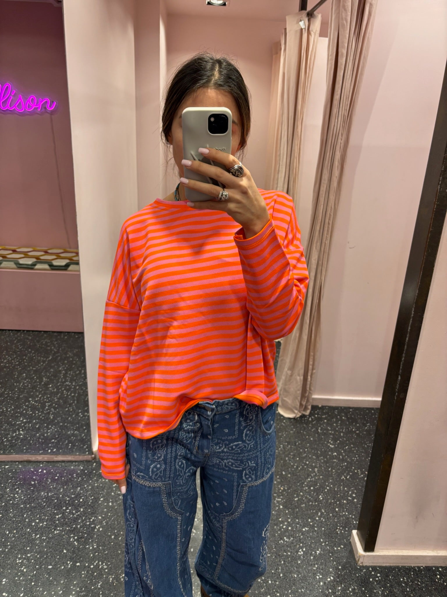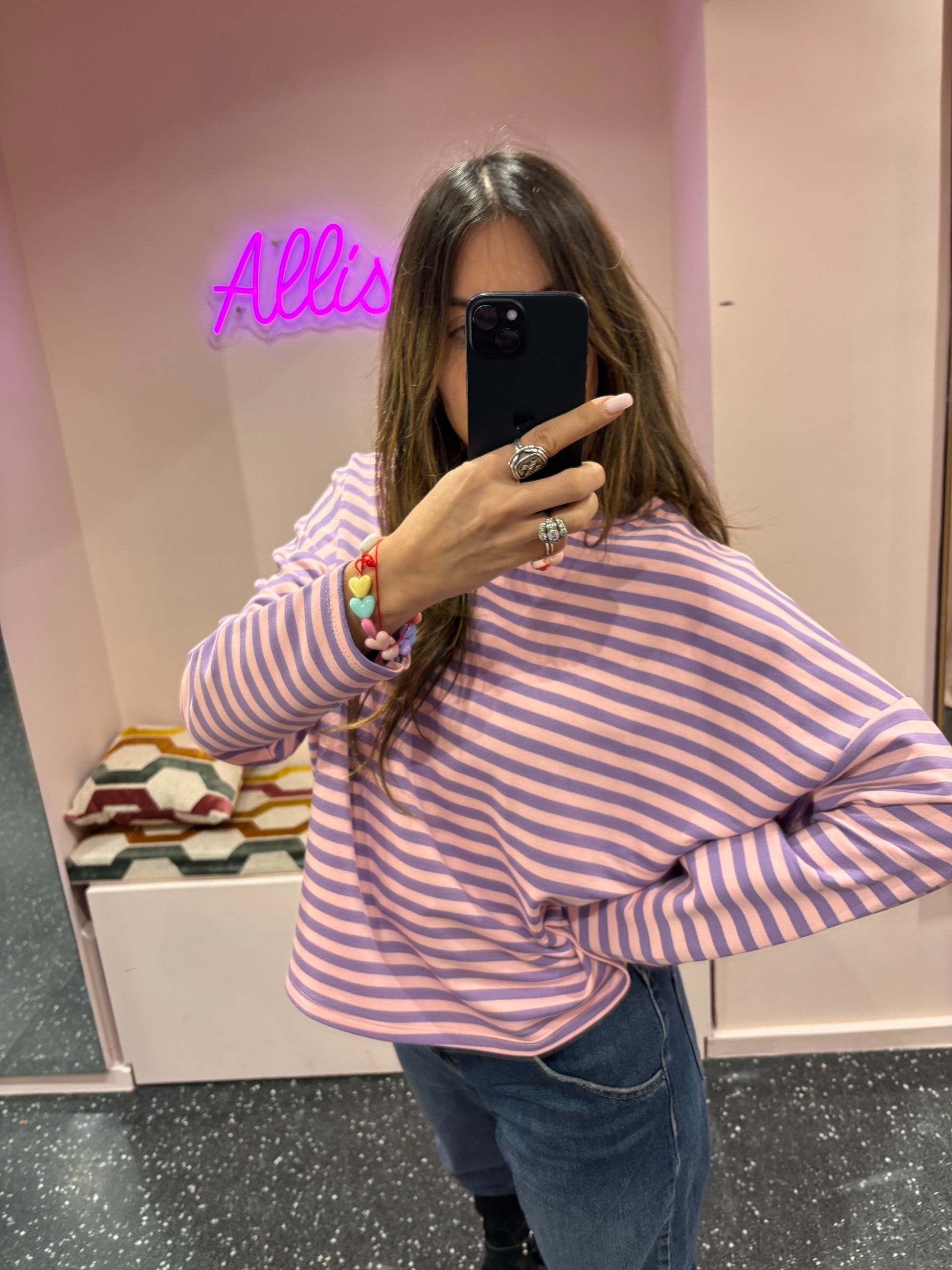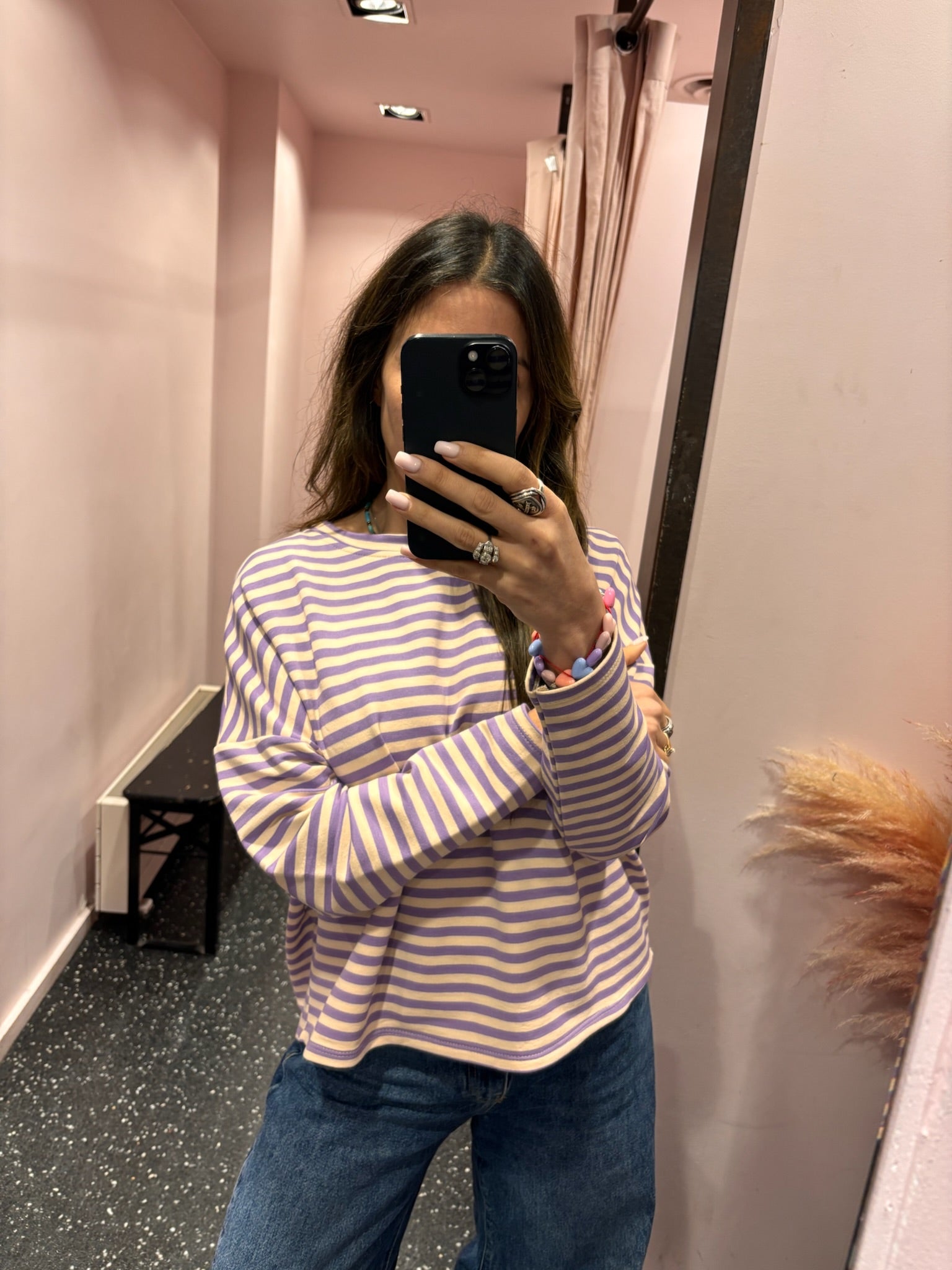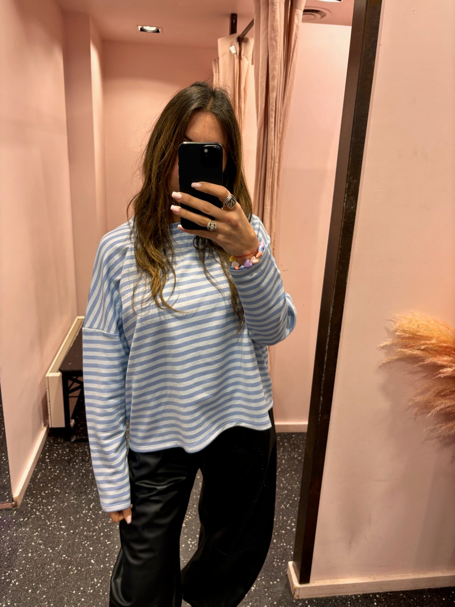 T-shirt oversize à manches longues confectionné en coton épais de haute qualité. Sa matière dense assure une excellente tenue dans le temps tout en restant confortable au quotidien. Les rayures apportent une touche graphique intemporelle, facile à intégrer dans un vestiaire casual ou plus structuré.