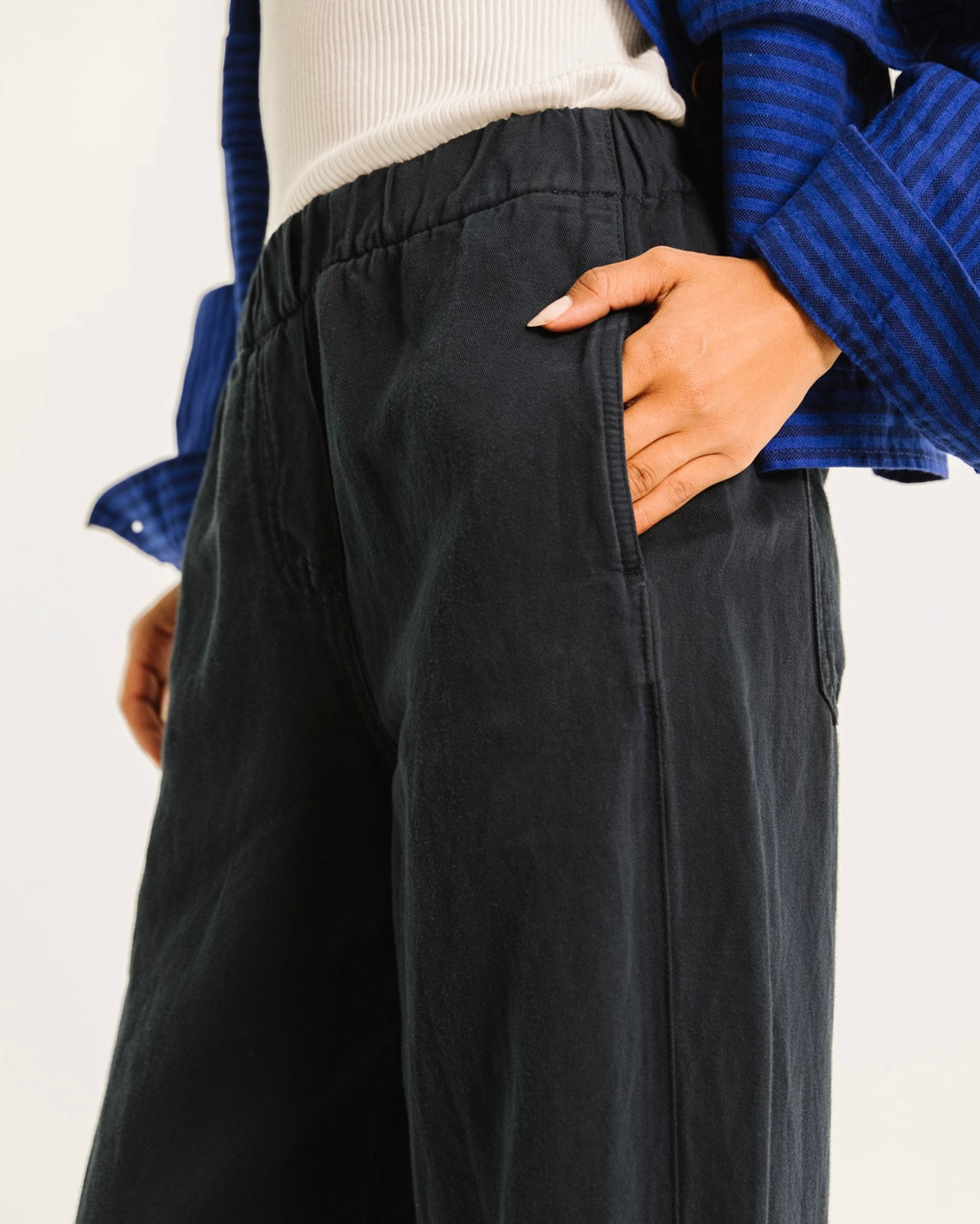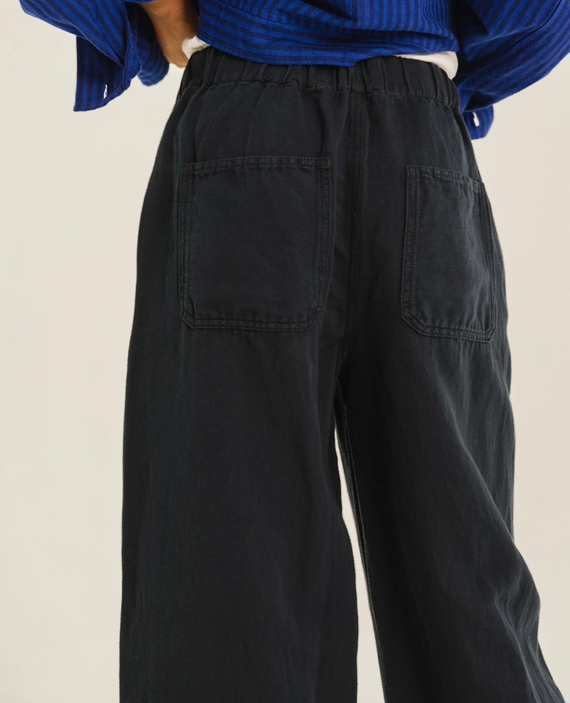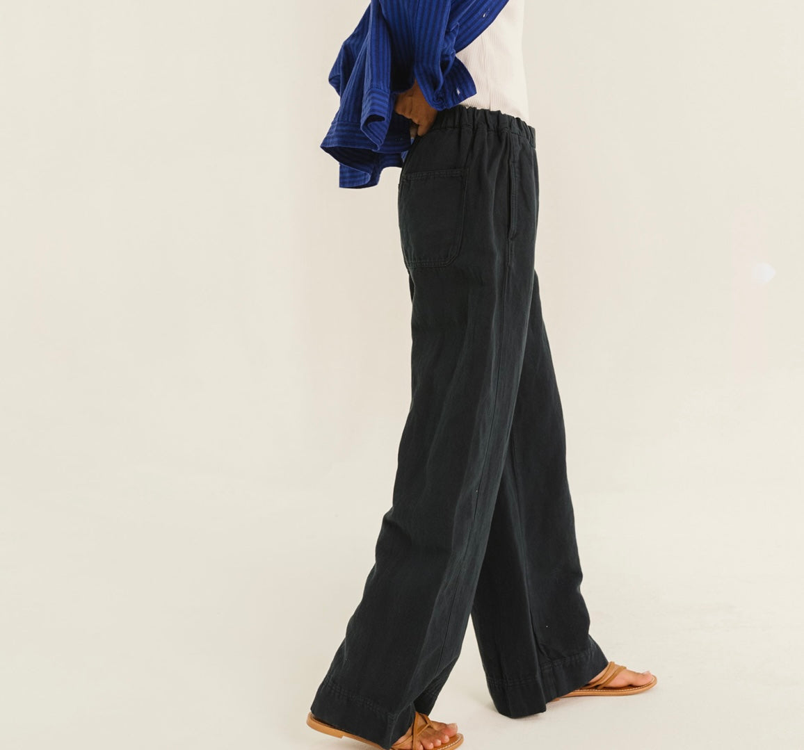 Un noir profond, net, presque graphique. Ce pantalon joue l’équilibre parfait entre confort et allure structurée. Sa ligne épurée allonge la jambe tandis que la taille souple apporte une aisance naturelle, sans jamais sacrifier l’élégance. Une pièce discrète mais forte, pensée pour accompagner le quotidien avec justesse.